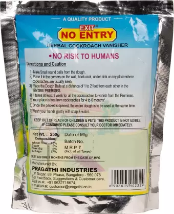 Directions and Caution are – 1) Make Small round balls from the dough. 2) Place it in the corners on the wall, book rack, under sink or any place where cockroaches are usually seen. 3) Place the Dough Balls at a distance of 1 to 2 feet from each other in the ENTIRE PREMISES. 4) It takes at least 1 week for all the cockroaches to vanish from the Premises. 5) Your place is free from cockroaches for 4 to 6 months. 6) Once the packet is opened, the entire dough is to be used at the same time. 7) Wash your hands gently with soap & water.